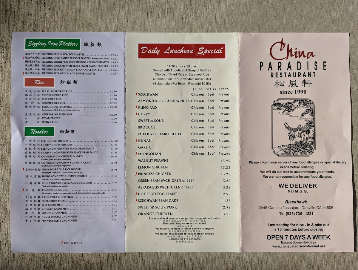 Located at 3446 Camino Tassajara, Danville, CA 94506, you can reach them at +1 925-736-1221 to place your order or inquire about their offerings. Discover your new favorite place to feast on delectable Chinese delicacies at China Paradise Restaurant!